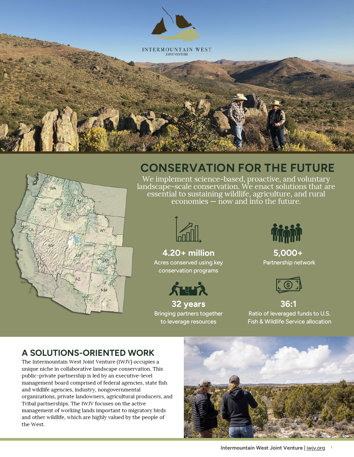 The IWJV philosophy can simply be described as a deep recognition that people are fundamental to the story of conservation in the West. People dedicated to working lands, both public and private, compose a huge part of our organizational landscape and are core to our everyday functions. Keystone tenets of the IWJV include finding common ground with others, using science to build durable conservation, and strengthening conservation through a lens of relevancy to people.