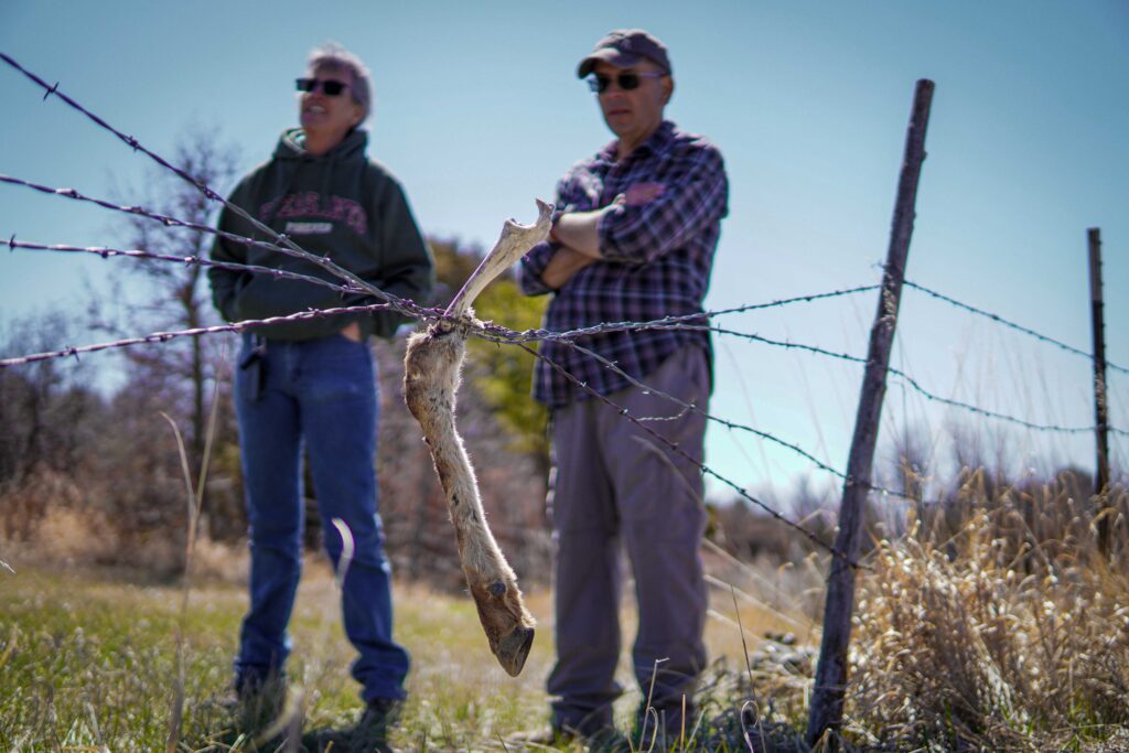 On a sunny, chilly April morning, McKim stands with Sabino, arms crossed, before the disembodied elk’s leg hanging from fence wire.