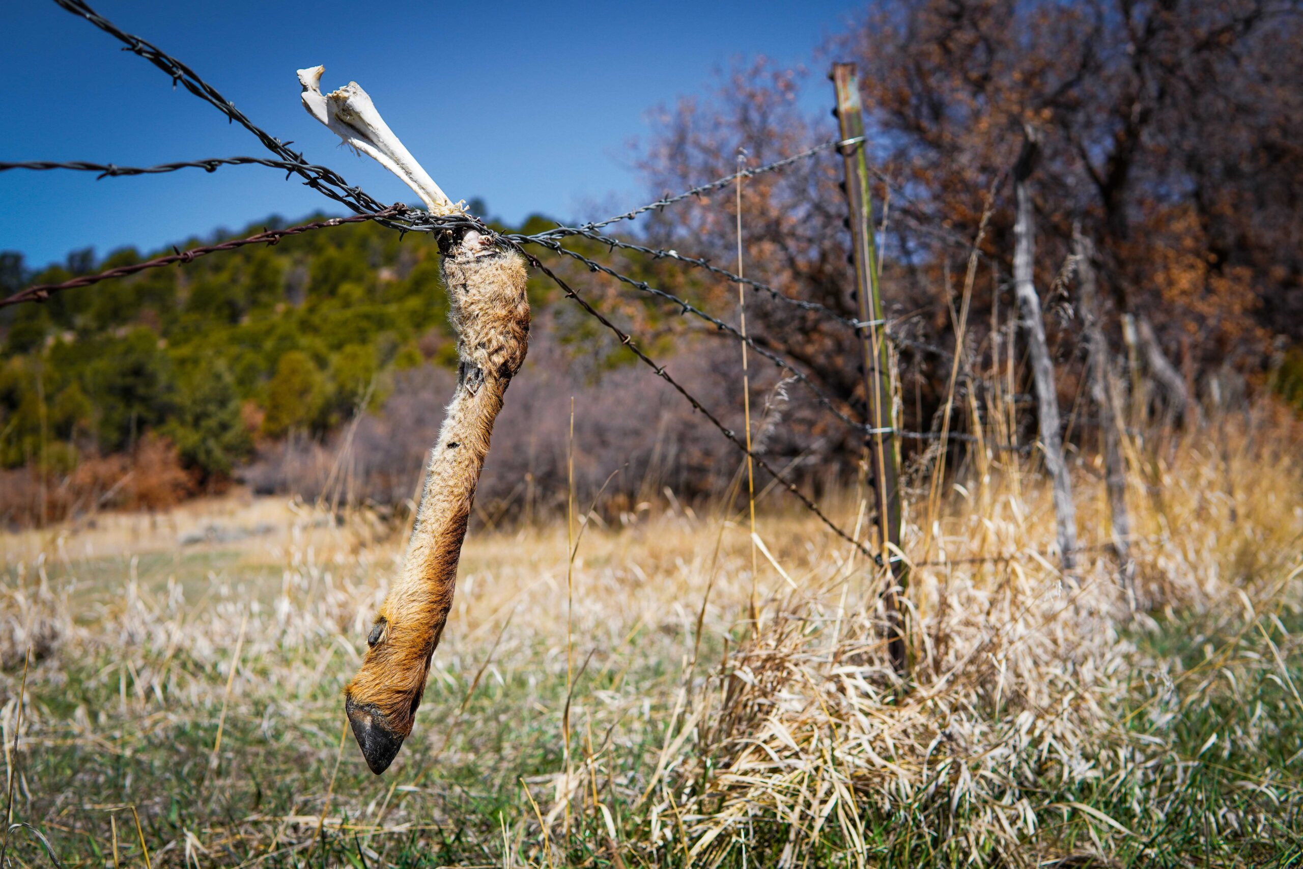 The Rivera’s pasture fences stand no chance before a never-ending influx of 600-pound elk, who vault their forelegs over the wires and then drag their heavy hindquarters through. The fences snap apart, recoiling sometimes for hundreds of meters. And that’s the best-case scenario. One morning on Sabino’s fence patrol, the worst-case scenario was waiting for him: the single disembodied leg of a juvenile elk twisted into the fence’s wires. The leg was all that remained of a gruesome scene: the elk got stuck, and then the coyotes found it.