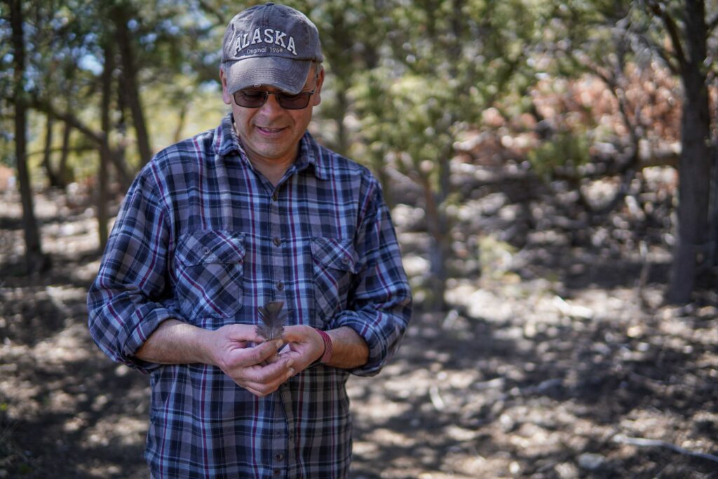 From that hill and its swirl of butterflies and birds, Sabino gestures out to the Jemez Mountains that overwhelm the horizon to the south, their silhouette dominated by the hulking flat-top mesa, Cerro Pedernal. The Ancestral Puebloans historically mined flint from Pedernal, Sabino says, for knapping and trading. The adjacent peak, Chicoma, they considered to be the center of the world. The land between this hill and those mountains is full of ghosts from 10,000 years of human habitation: beneath any given boulder you are as likely to find petroglyphs and potsherds as you are to find a rattlesnake, coiled up and hiding.